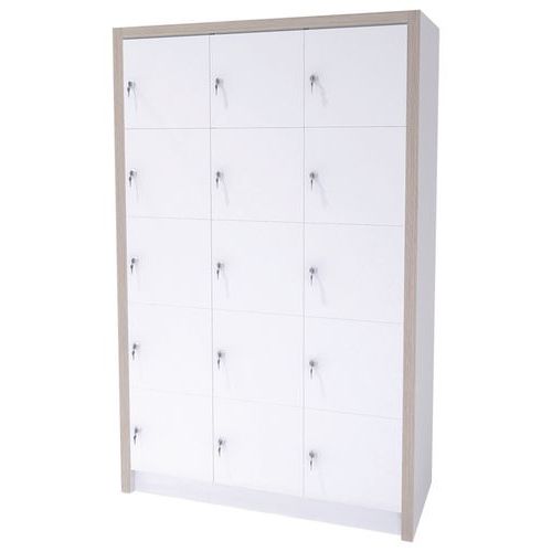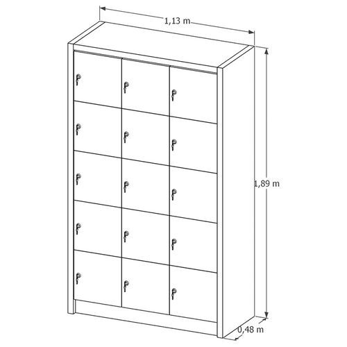 Meuble à cases avec portes idéal pour ordonner ses équipements au sein d'un lieu commun. Meuble livré monté sur socle réglable en hauteur. Réalisé en aggloméré mélaminé de 38 et 19 mm d'épaisseur. Chants ABS coloris chêne. Fermeture de la porte amortie, serrure à clé. Fabrication artisanale française. Garantie client : 10 ans