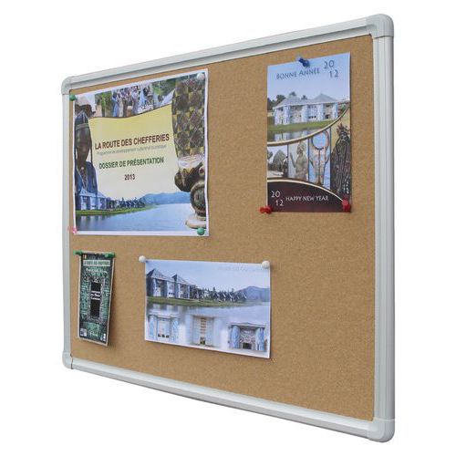 4 modèles disponibles : laqué, émaillé, mixte et liège Cadre aluminium anodisé épaisseur 15 mm avec coins PVC arrondis Panneau mixte moitié tôle laquée moitié liège Livrés sans visserie.