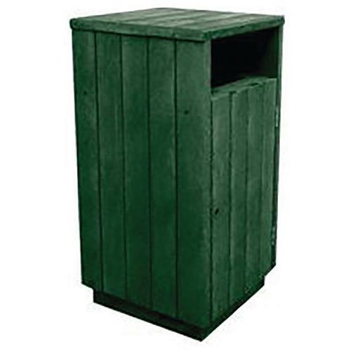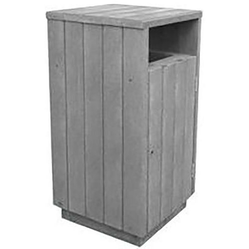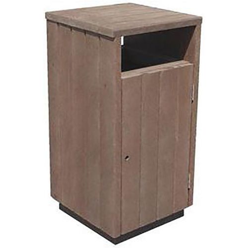 Ouverture en façade. Porte frontale, verrouillage par clé triangle. Autres coloris (vert, noir, sable, rouge, bleu et jaune) disponibles sur demande. Poubelle carrée avec protège-pluie et porte sac A fixer sur sol dur par scellement (2 équerres et 2 goujons d’ancrage fournis).
