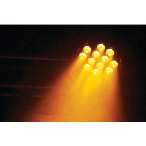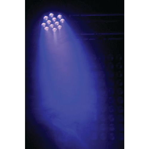 Un projecteur PAR, avec boîtier en ABS, puissant, avec LEDs 12 W RGBAW-UV. D'un design très plat, il peut être monté dans des portiques