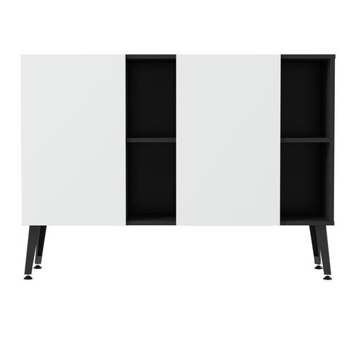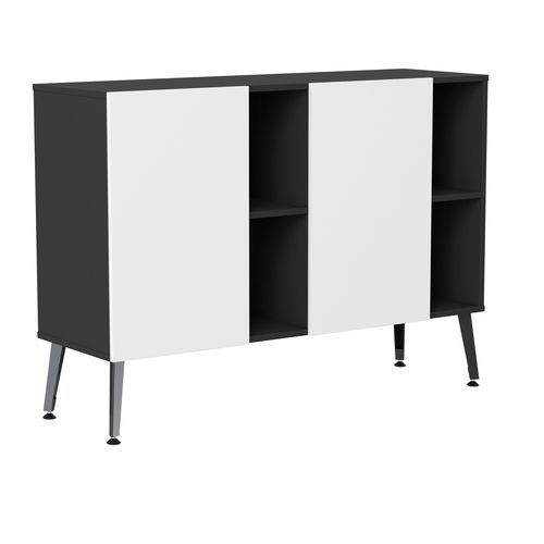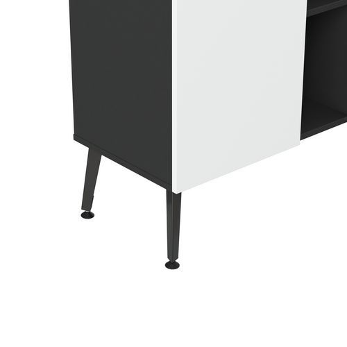 Rangement bas Teni 2 portes et 2 niches hauteur 101 cm. Panneaux en aggloméré ép 19 mm haute densité (680kg/m3), chant ép 2 mm finition mélaminée non feu catégorie M3. Portes avec systéme push to open . Piètement en tôle pliée épaisseur 2 mm de forme V. 4 vérins permettent un réglage jusqu’a 15 mm pour corriger le dénivelé du sol.