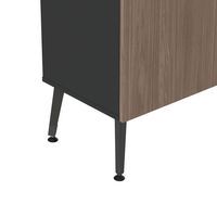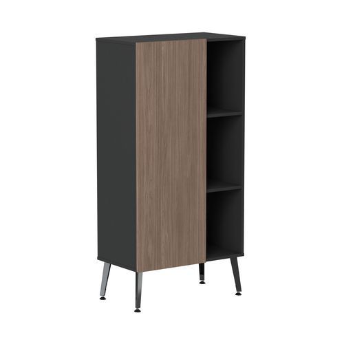 Rangement bas Teni 1 porte et 3 niches hauteur 160 cm. Panneaux en aggloméré ép 19 mm haute densité (680kg/m3), chant ép 2 mm finition mélaminée non feu catégorie M3. Portes avec systéme push to open . Piètement en tôle pliée épaisseur 2 mm de forme V. 4 vérins permettent un réglage jusqu’a 15 mm pour corriger le dénivelé du sol.
