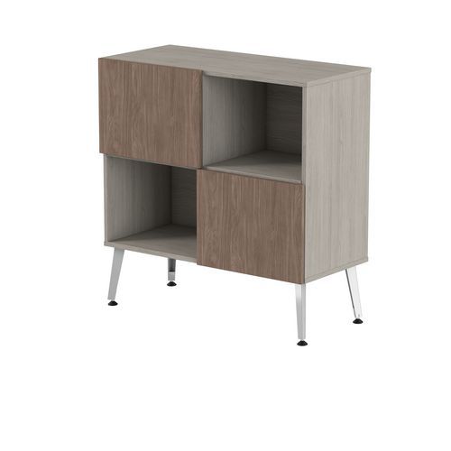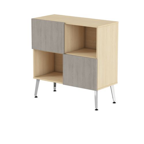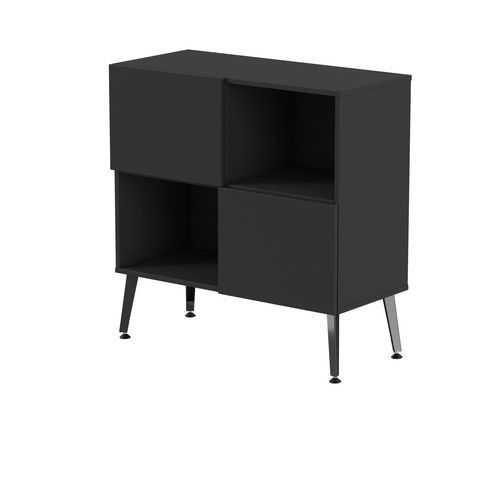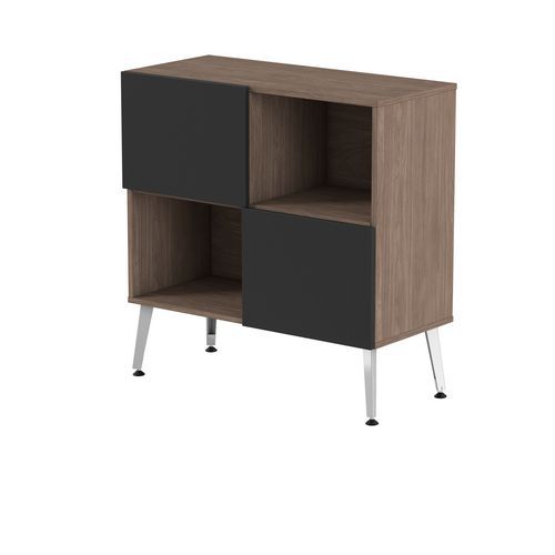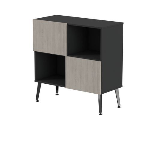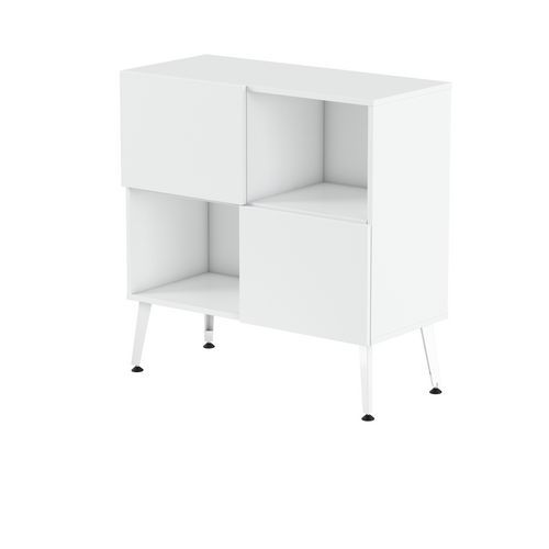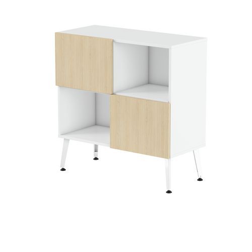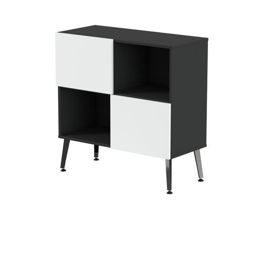 Rangement mi haut Teni 2 portes 2 cases en damier hauteur 101 cm. Panneaux en aggloméré ép 19 mm haute densité (680kg/m3), chant ép 2 mm finition mélaminée non feu catégorie M3. Portes avec systéme push to open . Piètement en tôle pliée épaisseur 2 mm de forme V. 4 vérins permettent un réglage jusqu’a 15 mm pour corriger le dénivelé du sol.