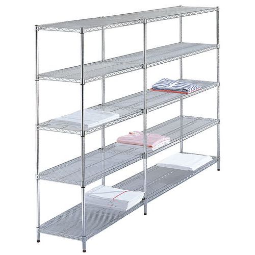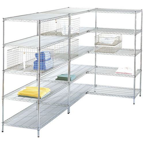 Montage facile, rapide et sans outil Hauteur et longueur au choix les espaces. A partir de 3 types d’éléments pré-composés, vous monterez très simplement des rayonnages parfaitement adaptés à votre établissement. Les rayonnages Hygirack sont en tube et fi l d’acier de très haute qualité. Les étagères sont en fi l à mailles serrées. Profondeur hors tout : 457 mm. Elément de base hauteur : 1,65 m ou 2,18 m. 2 échelles latérales 4 niveaux pour la hauteur 1,65 m et 5 niveaux pour la hauteur 2,18 m. 3 longueurs possibles hors tout : 610 mm , 910 mm, 1220 mm. Elément d'extension en ligne hauteur 1,65 m ou 2,18 m : 1 échelle latérale 4 niveaux pour la hauteur 1,65 m et 5 niveaux pour la hauteur 2,18 m. 3 longueurs possibles : 610, 910, 1220 mm Garantie client : 2 ans