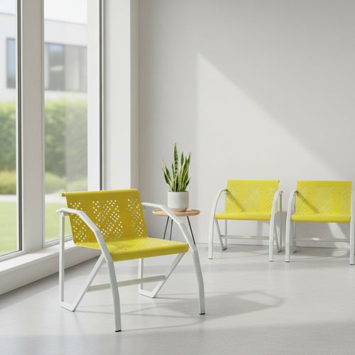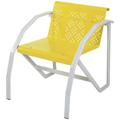 Fabrication française. Structure métal revêtue époxy coloris aluminium. Coque tôle perforée galbée. Piètement formant accoudoirs Garantie client : 10 ans Service installation/montage : Option montage
