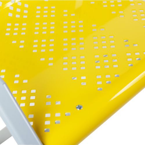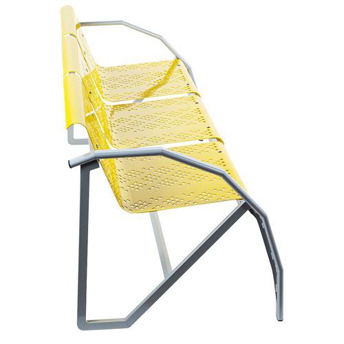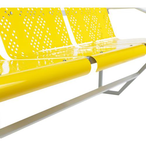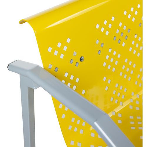 Fabrication française. Structure métal revêtue époxy coloris aluminium. Coque tôle perforée galbée. Piètement formant accoudoirs Service installation/montage : Option montage Garantie client : 10 ans