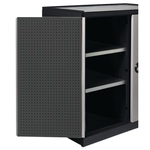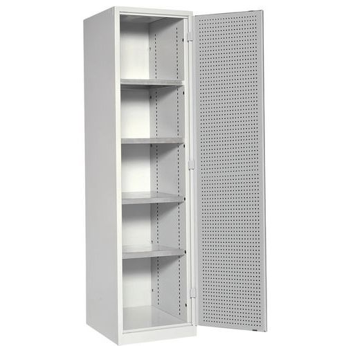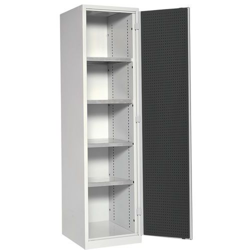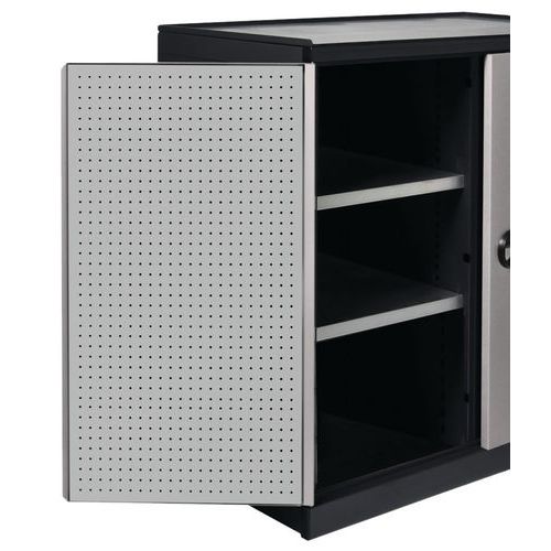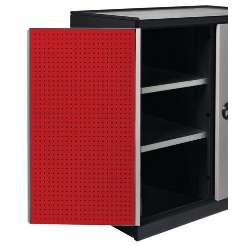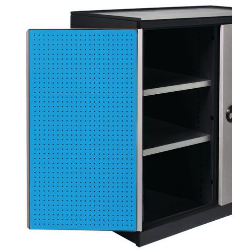 - Panneau support outillages soudé à l'intérieur de la porte d'armoire, en tôle acier LAF épaisseur 1mm (perforations carré 10x10mm au pas de 37mm).