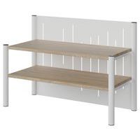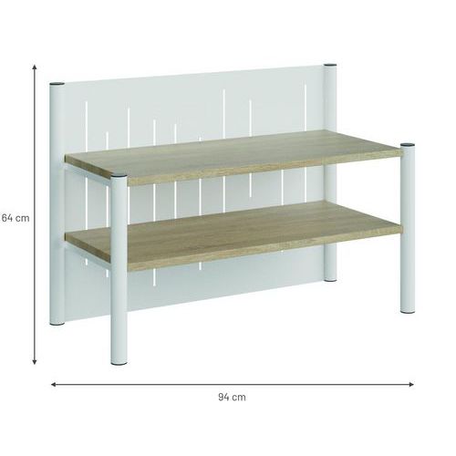 Surmeuble fond tôle acier pliée pour buffet 2 portes Malibu. Avec 2 étagères en mélaminé 2 faces 91.8 x 41 cm. Piètements tube acier Ø 40 mm, épaisseur 1,5 mm. Embouts polyéthylène noir non tachant, non marquant. Etagère épaisseur 19 mm ABS. Support tablettes tôle acier pliée, épaisseur 1 mm, rivetée aux piètements et vissés aux étagères bois. Soudure avec apport de matière. Poudre époxy. Dimensions entre les étagères : 208 mm ±3mm (soit 207 mm en tenant compte de l'épaisseur des équerres métalliques au niveau des extrémités). Livré monté.