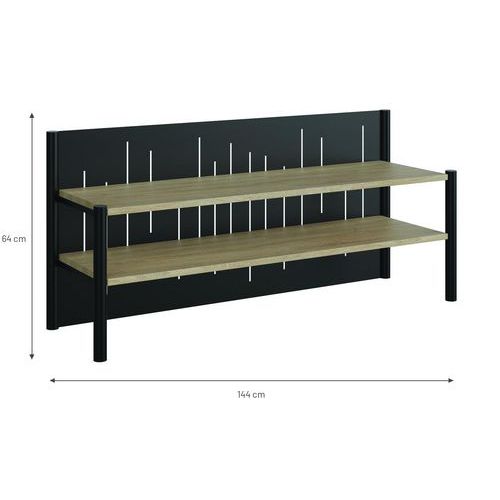 Surmeuble Malibu avec 2 étagères 135.8 x 41 cm, mélaminé 2 faces, épaisseur 19 mm ABS. Structure tube acier Ø 40 mm, épaisseur 1,5 mm. Support tablettes tôle acier pliée, épaisseur 1 mm, rivetée aux piètements et vissés aux étagères bois. Soudure avec apport de matière. Embouts polyéthylène noir non tachant, non marquant. Poudre époxy. Fabriqué en nouvelle Aquitaine Livré monté. Autres coloris disponibles sur demande.