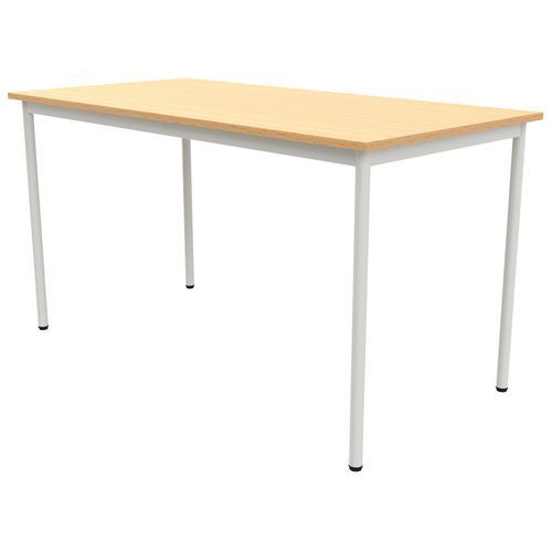 Table rectangulaire T1 à T6. 4 pieds droits, structure soudée Structure : traverses de renfort entre piètements. Tube acier rond Ø 32x1,5 mm. Soudures renforcées avec apport de métal. Embouts polyéthylène fixes mis en force fixations par ailettes avec vérins non tachants et anti bruit. Plateau : stratifié, contrebalancé. Chants ABS 2 mm. Panneau de particules d’une densité de 690 kg/m3 classé E1. Classement non feu M3. Conforme aux normes NFD 60-050, NFD 62-050 et NFD 62-070. Livré démonté Garantie client : 10 ans
