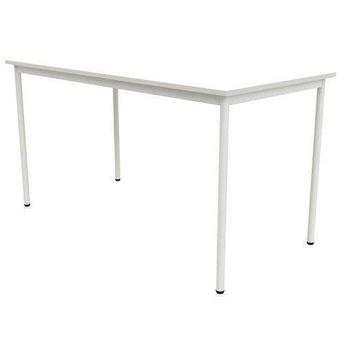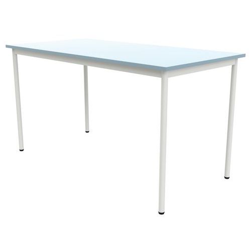 Table rectangulaire T1 à T6. 4 pieds droits, structure soudée Structure : traverses de renfort entre piètements. Tube acier rond Ø 32x1,5 mm. Soudures renforcées avec apport de métal. Embouts polyéthylène fixes mis en force fixations par ailettes avec vérins non tachants et anti bruit. Plateau : stratifié, contrebalancé. Chants ABS 2 mm. Panneau de particules d’une densité de 690 kg/m3 classé E1. Classement non feu M3. Conforme aux normes NFD 60-050, NFD 62-050 et NFD 62-070. Livré démonté