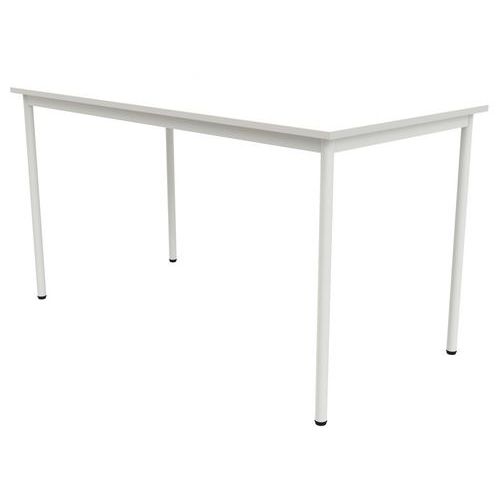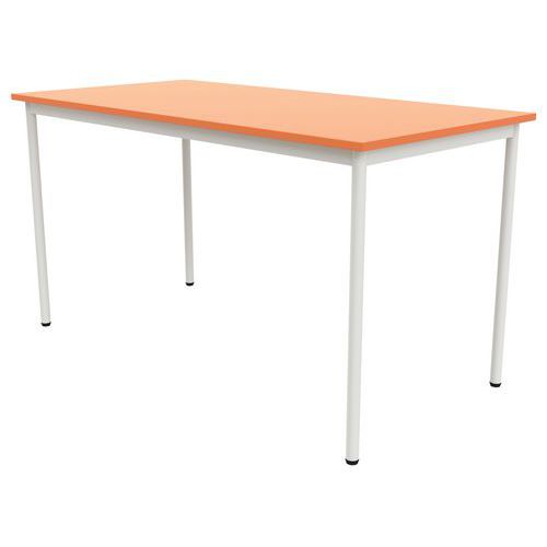 Table carrée T1 à T6. 4 pieds droits, structure soudée. Structure : traverses de renfort entre piètements. Tube acier rond Ø 32x1,5 mm. Soudures renforcées avec apport de métal. Embouts polyéthylène fixes mis en force fixations par ailettes avec vérins non tachants et anti bruit. Plateau : stratifié, contrebalancé. Chants ABS 2 mm. Panneau de particules d’une densité de 690 kg/m3 classé E1. Classement non feu M3. Conforme aux normes NFD 60-050, NFD 62-050 et NFD 62-070. Livré démonté Garantie client : 10 ans