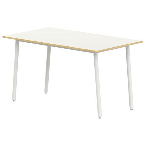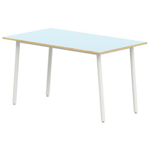 Table rectangulaire T1 à T6. 4 pieds inclinés, structure soudée Structure : traverses de renforts entre piètements. Tube acier rond Ø 32 x 1,5 mm. Soudures renforcées avec apport de métal. Embouts polyéthylène, fixations par ailettes. Vérins réglables non tachants et anti-bruit. Plateau : stratifié, contrebalancé. Chants ABS 2 mm. Panneau de particules d’une densité de 690 kg/m3 classé E1. Classement non feu M3. Conforme aux normes NFD 60-050, NFD 62-050 et NFD 62-070. Livré démonté Garantie client : 10 ans