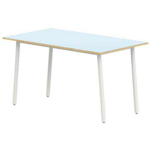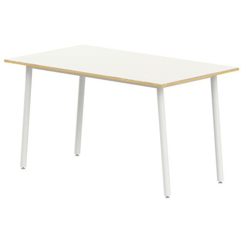Table rectangulaire T1 à T6. 4 pieds inclinés, structure soudée Structure : traverses de renforts entre piètements. Tube acier rond Ø 32 x 1,5 mm. Soudures renforcées avec apport de métal. Embouts polyéthylène, fixations par ailettes. Vérins réglables non tachants et anti-bruit. Plateau : stratifié, contrebalancé. Chants ABS 2 mm. Panneau de particules d’une densité de 690 kg/m3 classé E1. Classement non feu M3. Conforme aux normes NFD 60-050, NFD 62-050 et NFD 62-070. Livré démonté Garantie client : 10 ans