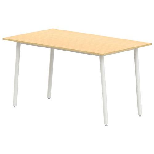 Table rectangulaire T1 à T6. 4 pieds inclinés, structure soudée Structure : traverses de renforts entre piètements. Tube acier rond Ø 32 x 1,5 mm. Soudures renforcées avec apport de métal. Embouts polyéthylène, fixations par ailettes. Vérins réglables non tachants et anti-bruit. Plateau : stratifié, contrebalancé. Chants ABS 2 mm. Panneau de particules d’une densité de 690 kg/m3 classé E1. Classement non feu M3. Conforme aux normes NFD 60-050, NFD 62-050 et NFD 62-070. Livré démonté