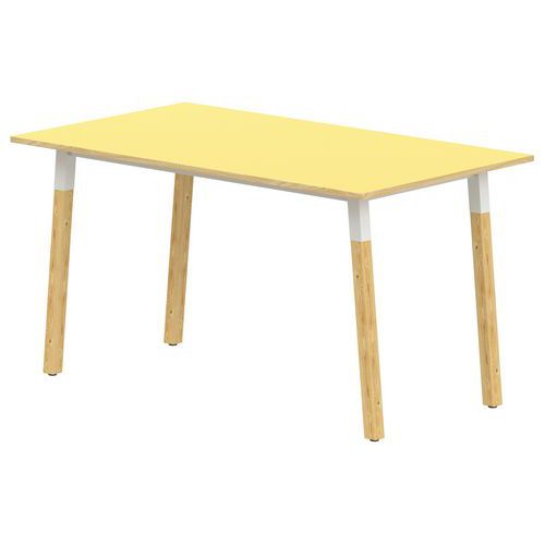Table rectangulaire T1 à T6. 4 pieds inclinés métal et bois, cadre soudé Structure : traverses de renforts entre piètements. Piètement en hêtre massif de section 45x45 mm vernis polyuréthane bicouche. Soudures renforcées avec apport de métal. Vérins réglables non tachants et anti-bruit. Plateau : stratifié, contrebalancé. Chants ABS 2 mm. Panneau de particules d’une densité de 690 kg/m3 classé E1. Classement non feu M3. Conforme aux normes NFD 60-050, NFD 62-050 et NFD 62-070. Livré démonté Garantie client : 10 ans