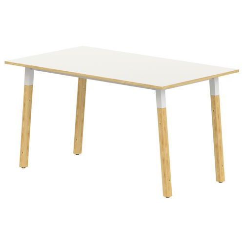 Table rectangulaire T1 à T6. 4 pieds inclinés métal et bois, cadre soudé Structure : traverses de renforts entre piètements. Piètement en hêtre massif de section 45x45 mm vernis polyuréthane bicouche. Soudures renforcées avec apport de métal. Vérins réglables non tachants et anti-bruit. Plateau : stratifié, contrebalancé. Chants ABS 2 mm. Panneau de particules d’une densité de 690 kg/m3 classé E1. Classement non feu M3. Conforme aux normes NFD 60-050, NFD 62-050 et NFD 62-070. Livré démonté Garantie client : 10 ans