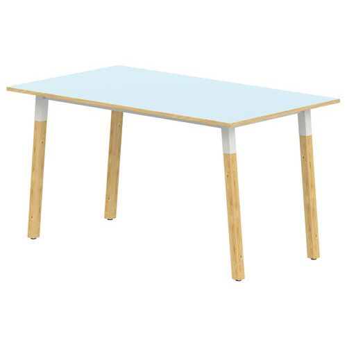 Table carrée T1 à T6. 4 pieds inclinés métal et bois, cadre soudé Structure : traverses de renforts entre piètements. Piètement en hêtre massif de section 45x45 mm vernis polyuréthane bicouche. Soudures renforcées avec apport de métal. Vérins réglables non tachants et anti-bruit. Plateau : stratifié, contrebalancé. Chants ABS 2 mm. Panneau de particules d’une densité de 690 kg/m3 classé E1. Classement non feu M3. Conforme aux normes NFD 60-050, NFD 62-050 et NFD 62-070. Livré démonté