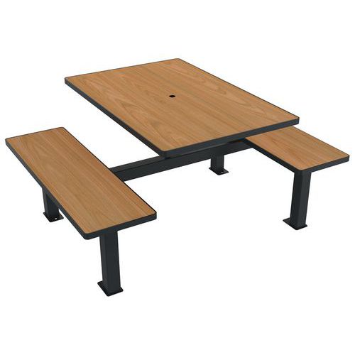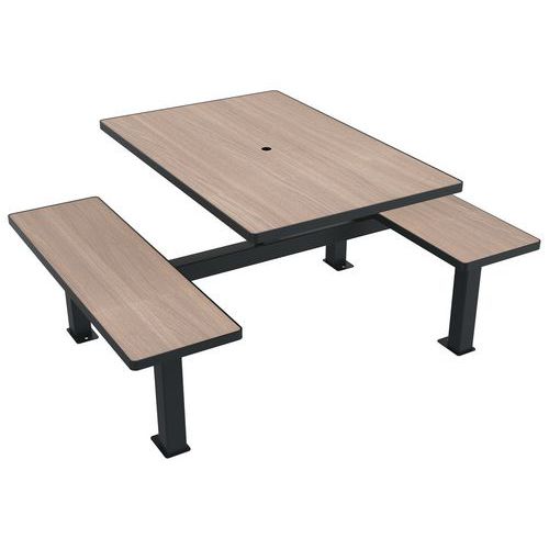 Table bancs ORPIN esthétique avec son cerclage de finition et habillage aspect bois. Facilité d’installation grâce à sa structure monobloc. Inclusive : accessibilité pour les fauteuils roulants, poussettes. Confortable : pas besoin d’enjamber la table pour s’asseoir. Matériaux résistants et adaptés à une utilisation intensive Plateau et assise compact HPL. Trou de parasol Ø 5 cm. Structure acier traité anticorrosion et poudré anti-UV. A cheviller en 4 points d'ancrage (kit de fixation non inclus, vendu en option). Autres coloris RAL acier et stratifié compact, disponibles sur demande