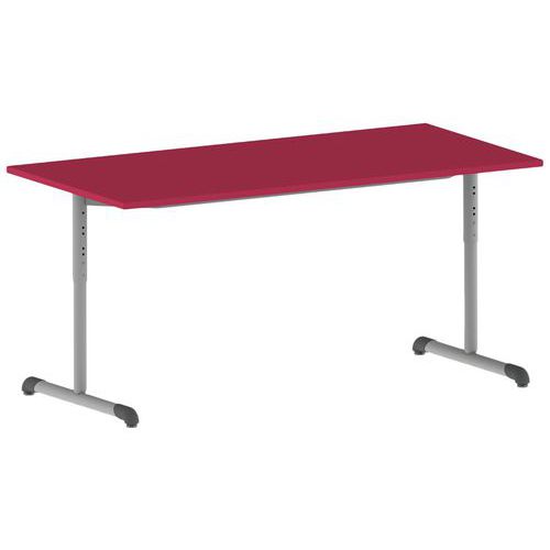 Table réglable avec plateau stratifié, dessous contrebalancement, chant plaqué ABS contretypé. Piètement avec semelle droite et montant en tube acier, cadre soudé sous plateau. Embouts coiffants et vérins de réglages, non marquants et non tachants en polyéthylène