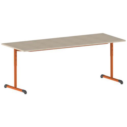 Table réglable avec plateau stratifié, dessous contrebalancement, chant plaqué ABS contretypé. Piètement avec semelle droite et montant en tube acier, cadre soudé sous plateau. Embouts coiffants et vérins de réglages, non marquants et non tachants en polyéthylène