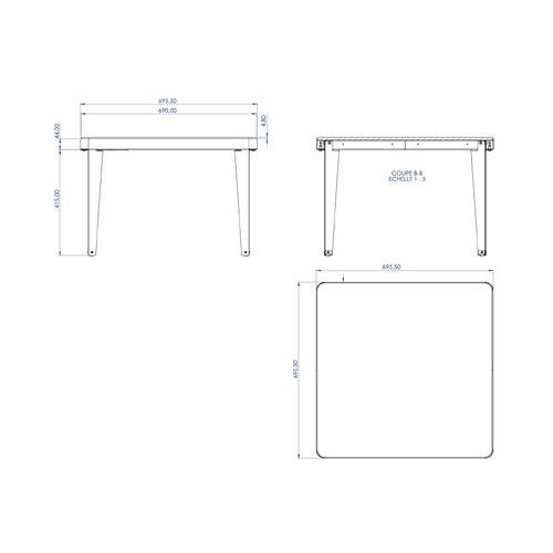 Mobilier éco-conçu, durable et réparable. En un tour de main, sans aucun outil, il est possible de retourner leur plateau et donc de changer complètement leur esthétique. Une face en acier coloris assortis au piètement et une face en PEHD (polyéthylène haute densité) 100% issu de l'écoomie circulaire soit blanc moucheté soit décor confettis de style terrazzo. Montage très rapide et livraison à plat pour des gains de volume de transport. Fabrication française. Le coloris confettis est obtenu en mélangeant des bouchons de bouteille qui sont broyés et du polyéthylène haute densité 100% recyclé blanc moucheté.