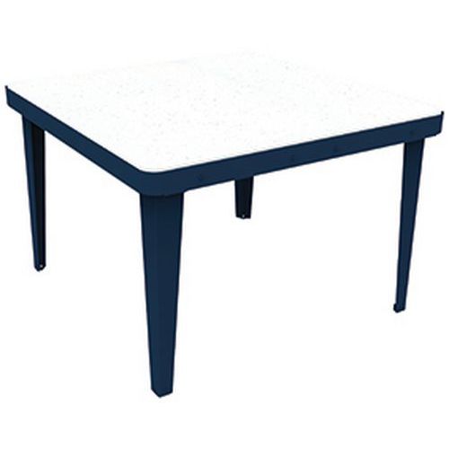 Mobilier éco-conçu, durable et réparable. En un tour de main, sans aucun outil, il est possible de retourner leur plateau et donc de changer complètement leur esthétique. Une face en acier coloris assortis au piètement et une face en PEHD (polyéthylène haute densité) 100% issu de l'écoomie circulaire soit blanc moucheté soit décor confettis de style terrazzo. Montage très rapide et livraison à plat pour des gains de volume de transport. Fabrication française. Le coloris confettis est obtenu en mélangeant des bouchons de bouteille qui sont broyés et du polyéthylène haute densité 100% recyclé blanc moucheté.