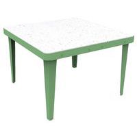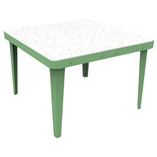 Mobilier éco-conçu, durable et réparable. En un tour de main, sans aucun outil, il est possible de retourner leur plateau et donc de changer complètement leur esthétique. Une face en acier coloris assortis au piètement et une face en PEHD (polyéthylène haute densité) 100% issu de l'écoomie circulaire soit blanc moucheté soit décor confettis de style terrazzo. Montage très rapide et livraison à plat pour des gains de volume de transport. Fabrication française. Le coloris confettis est obtenu en mélangeant des bouchons de bouteille qui sont broyés et du polyéthylène haute densité 100% recyclé blanc moucheté.
