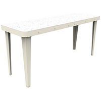 Mobilier éco-conçu, durable et réparable. En un tour de main, sans aucun outil, il est possible de retourner leur plateau et donc de changer complètement leur esthétique. Une face en acier coloris assortis au piètement et une face en PEHD (polyéthylène haute densité) 100% issu de l'écoomie circulaire soit blanc moucheté soit décor confettis de style terrazzo. Montage très rapide et livraison à plat pour des gains de volume de transport. Fabrication française. Le coloris confettis est obtenu en mélangeant des bouchons de bouteille qui sont broyés et du polyéthylène haute densité 100% recyclé blanc moucheté.