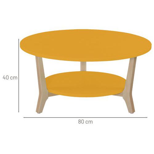 Table basse Zélos piètement hêtre massif qui allie esthétique et solidité . Plateaux revêtus mélaminé 19 mm. Chants plaqués. Fabriquée en France. Plateau inférieur Ø 52 cm. Livrée montée.