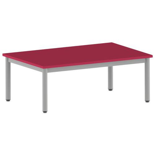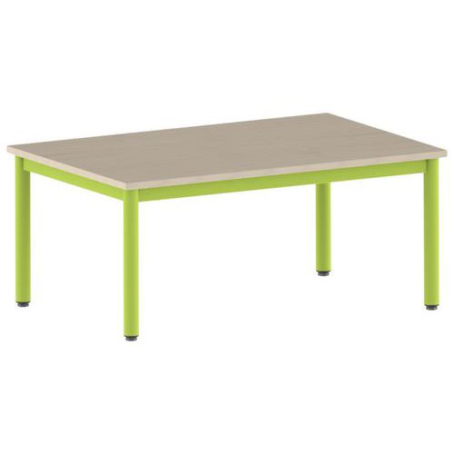 Table avec plateau stratifié, dessous contrebalancement blanc et chant plaqué ABS contretypé. Piètement en tube acier, cadre soudé. Vérins de réglage non tachants et non marquants