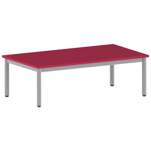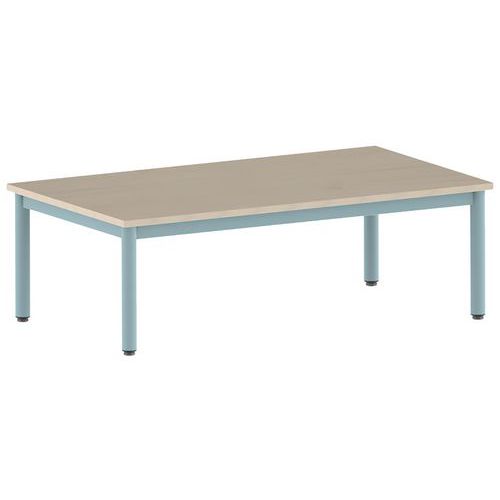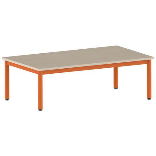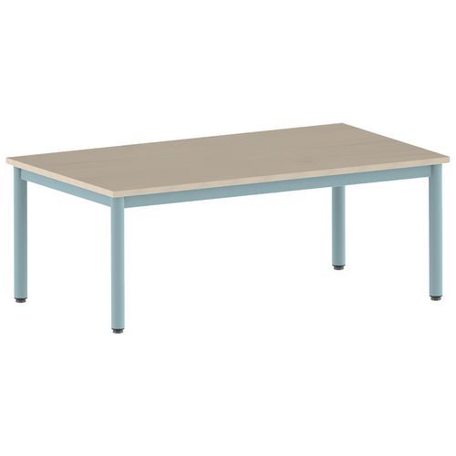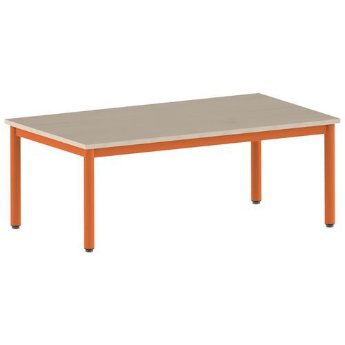 Table avec plateau stratifié, dessous contrebalancement blanc et chant plaqué ABS contretypé. Piètement en tube acier, cadre soudé. Vérins de réglage non tachants et non marquants