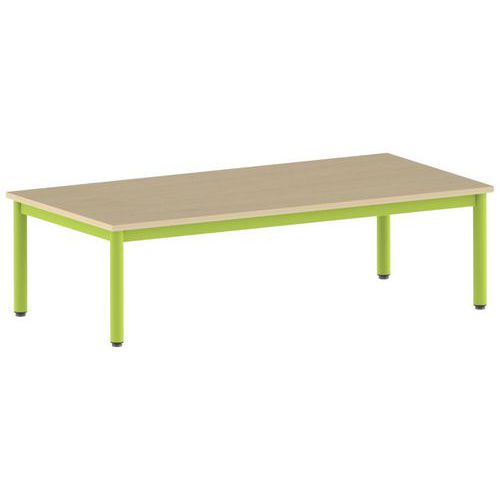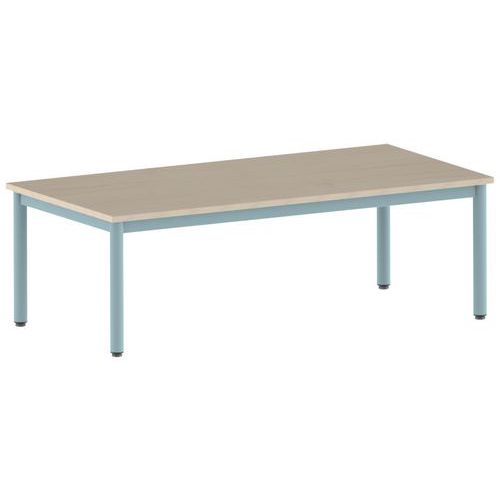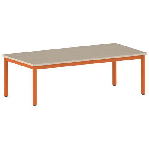 Table avec plateau stratifié, dessous contrebalancement blanc et chant plaqué ABS contretypé. Piètement en tube acier, cadre soudé. Vérins de réglage non tachants et non marquants