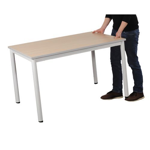 Table avec plateau stratifié, dessous contrebalancement blanc, chant plaqué ABS contretypé assorti au dessus du plateau. Piètement en tube acier, cadre soudé. Embouts avec roulettes et butées intégrées