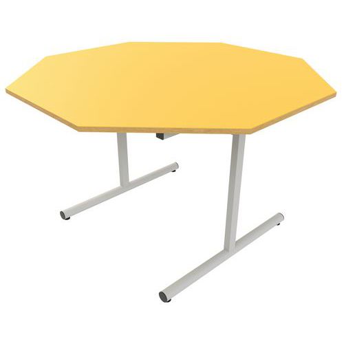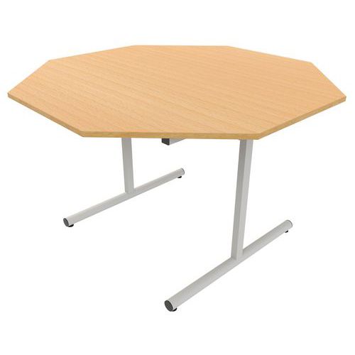 Table octogonale T1 à T6. Piètement à dégagement latéral soudé Structure : traverses de renforts soudées 40 x 30 x 1,5 mm sous plateau fixation par vis à bois. Tube acier rond Ø 45 x 1,5 mm, montant en tube de 40 x 30 x 1,5 mm. Soudures renforcées avec apport de métal. Embouts polyéthylène, fixations par ailettes. Vérins de réglages avec patins anti-tâches et insonores. Plateau : stratifié, contrebalancé. Chants ABS 2 mm. Panneau de particules d’une densité de 690 kg/m3 classé E1. Classement non feu M3. Conforme aux normes NFD 60-050, NFD 62-050 et NFD 62-070. Livré démonté Garantie client : 10 ans