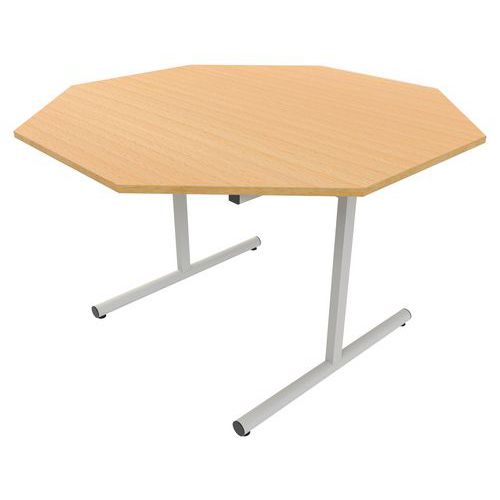 Table octogonale T1 à T6. Piètement à dégagement latéral soudé Structure : traverses de renforts soudées 40 x 30 x 1,5 mm sous plateau fixation par vis à bois. Tube acier rond Ø 45 x 1,5 mm, montant en tube de 40 x 30 x 1,5 mm. Soudures renforcées avec apport de métal. Embouts polyéthylène, fixations par ailettes. Vérins de réglages avec patins anti-tâches et insonores. Plateau : stratifié, contrebalancé. Chants ABS 2 mm. Panneau de particules d’une densité de 690 kg/m3 classé E1. Classement non feu M3. Conforme aux normes NFD 60-050, NFD 62-050 et NFD 62-070. Livré démonté Garantie client : 10 ans