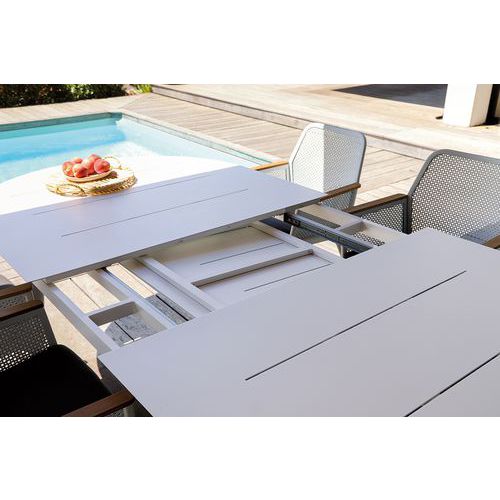 Table Dublin carrée avec allonge papillon. Structure en aluminium. Pieds ronds de 6 cm. Plateau strié Garantie client : 2 ans