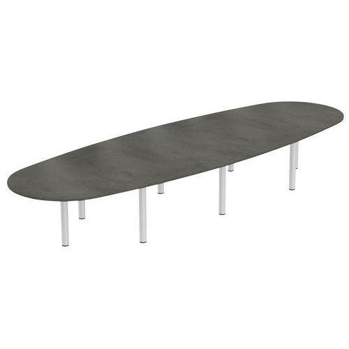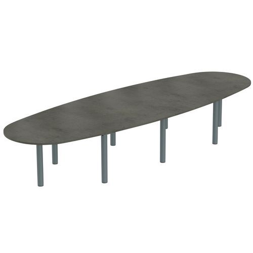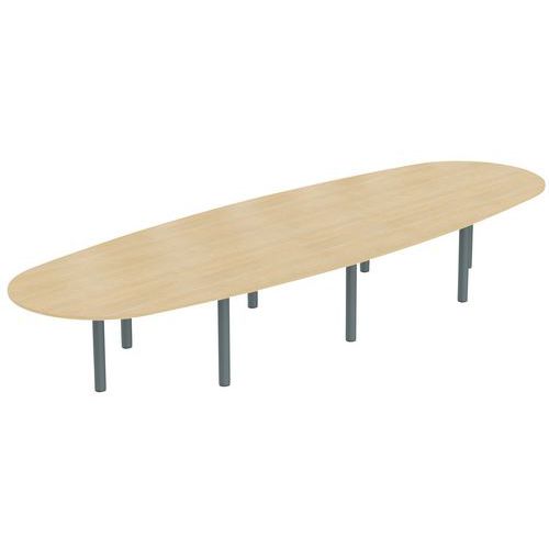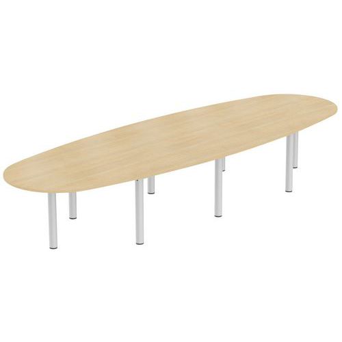 Plateau panneau de particules épaisseur 25 mm. Surface mélaminé, avec chants droits. Plateau hauteur 72 cm. Plateaux renforcés par une traverse métal. Piètement tube métal Ø 80 mm revêtu époxy. Equipé de vérins de réglage. Platine de liaison en métal épaisseur 3 mm. Table proposée en 4 dimensions (sur mesure possible, nous consulter). Plateau livré en plusieurs parties : 4 pour table 420 et 480 cm, 5 pour table 560 cm et 6 pour table 630 cm. Livré prêt à monter avec notice.