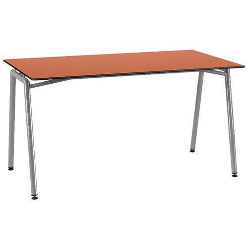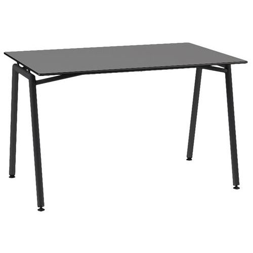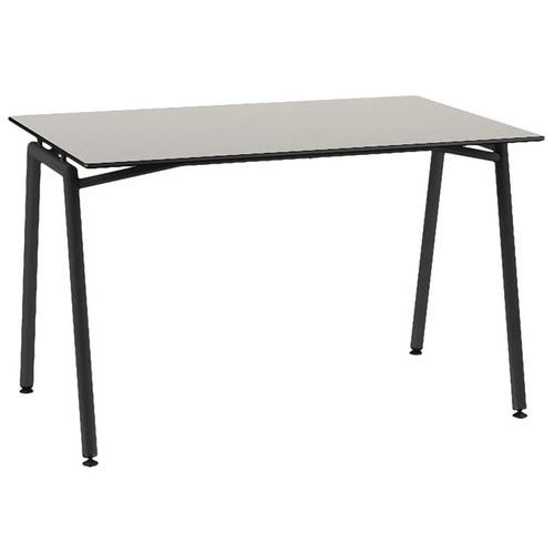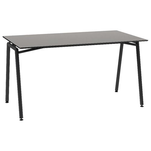 Table avec plateau stratifié, dessous contrebalancement blanc et chant brut ame noir. Piètement acier entièrement soudé et composé de 2 pieds en tube, 4 entretoises en tube et 2 renforts. Contact au sol par douilles polypropylène noir avec vérins orientables en polyamide noir