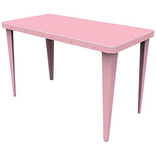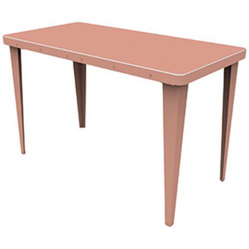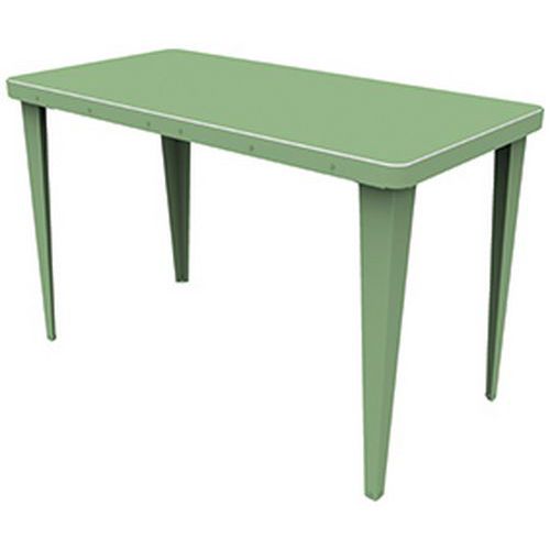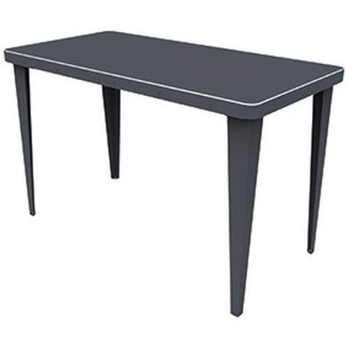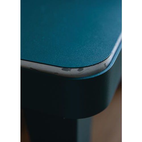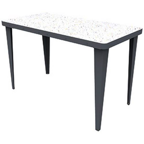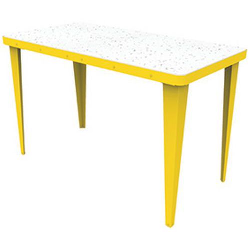 Mobilier éco-conçu, durable et réparable. En un tour de main, sans aucun outil, il est possible de retourner leur plateau et donc de changer complètement leur esthétique. Une face en acier coloris assortis au piètement et une face en PEHD (polyéthylène haute densité) 100% issu de l'économie circulaire soit blanc moucheté. soit décor confettis de style terrazzo. Montage très rapide et livraison à plat pour des gains de volume de transport. Fabrication française. Le coloris confettis est obtenu en mélangeant des bouchons de bouteille qui sont broyés et du polyéthylène haute densité 100% recyclé blanc moucheté.