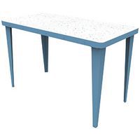 Mobilier éco-conçu, durable et réparable. En un tour de main, sans aucun outil, il est possible de retourner leur plateau et donc de changer complètement leur esthétique. Une face en acier coloris assortis au piètement et une face en PEHD (polyéthylène haute densité) 100% issu de l'économie circulaire soit blanc moucheté. soit décor confettis de style terrazzo. Montage très rapide et livraison à plat pour des gains de volume de transport. Fabrication française. Le coloris confettis est obtenu en mélangeant des bouchons de bouteille qui sont broyés et du polyéthylène haute densité 100% recyclé blanc moucheté.