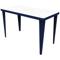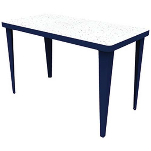 Mobilier éco-conçu, durable et réparable. En un tour de main, sans aucun outil, il est possible de retourner leur plateau et donc de changer complètement leur esthétique. Une face en acier coloris assortis au piètement et une face en PEHD (polyéthylène haute densité) 100% issu de l'économie circulaire soit blanc moucheté. soit décor confettis de style terrazzo. Montage très rapide et livraison à plat pour des gains de volume de transport. Fabrication française. Le coloris confettis est obtenu en mélangeant des bouchons de bouteille qui sont broyés et du polyéthylène haute densité 100% recyclé blanc moucheté.