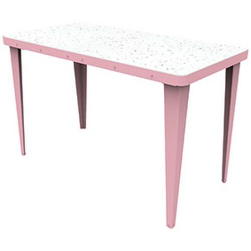 Mobilier éco-conçu, durable et réparable. En un tour de main, sans aucun outil, il est possible de retourner leur plateau et donc de changer complètement leur esthétique. Une face en acier coloris assortis au piètement et une face en PEHD (polyéthylène haute densité) 100% issu de l'économie circulaire soit blanc moucheté. soit décor confettis de style terrazzo. Montage très rapide et livraison à plat pour des gains de volume de transport. Fabrication française. Le coloris confettis est obtenu en mélangeant des bouchons de bouteille qui sont broyés et du polyéthylène haute densité 100% recyclé blanc moucheté.