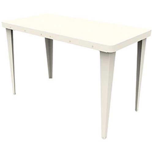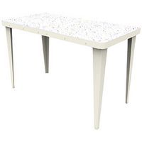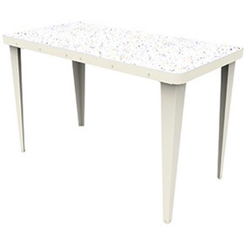 Mobilier éco-conçu, durable et réparable. En un tour de main, sans aucun outil, il est possible de retourner leur plateau et donc de changer complètement leur esthétique. Une face en acier coloris assortis au piètement et une face en PEHD (polyéthylène haute densité) 100% issu de l'économie circulaire soit blanc moucheté. soit décor confettis de style terrazzo. Montage très rapide et livraison à plat pour des gains de volume de transport. Fabrication française. Le coloris confettis est obtenu en mélangeant des bouchons de bouteille qui sont broyés et du polyéthylène haute densité 100% recyclé blanc moucheté.