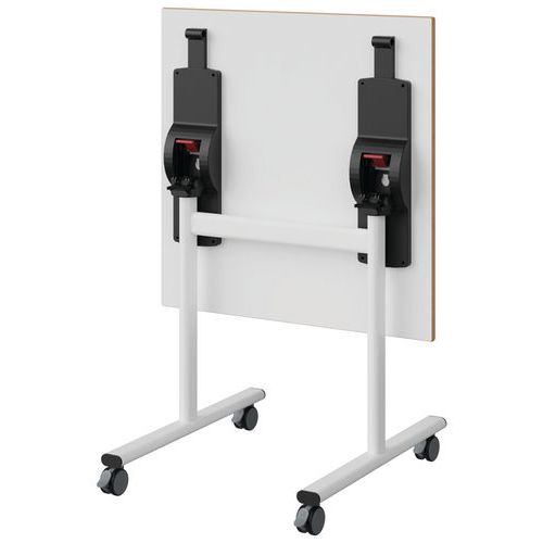 Table Malibu rabattable à dégagement latéral avec plateau aggloméré stratifié, épaisseur 21 mm, chant alaisé. Contrebalancement stratifié sous plateau blanc. Piètement tube acier, soudure avec apport de matière. Système basculant avec blocage en plastique. Roulettes pivotantes avec frein. Embouts avec verins de réglage en polyéthylène noir non tachant, non marquant. Poudre époxy. Fabriqué en Nouvelle Aquitaine. Livré monté. Autres coloris disponibles sur demande.
