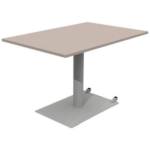 Table Mano mobile avec plateau stratifié contrebalancé chant ABS. Contact au sol par caoutchouc adhésifs et 2 roulettes. Piètement avec tube acier et 4 supports plateau soudés. 1 embase en tôle acier fixée par vis.