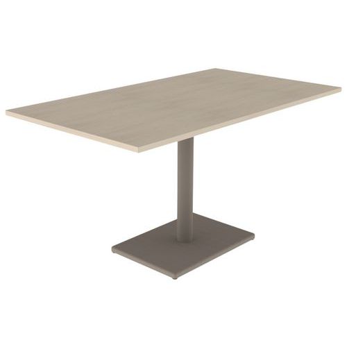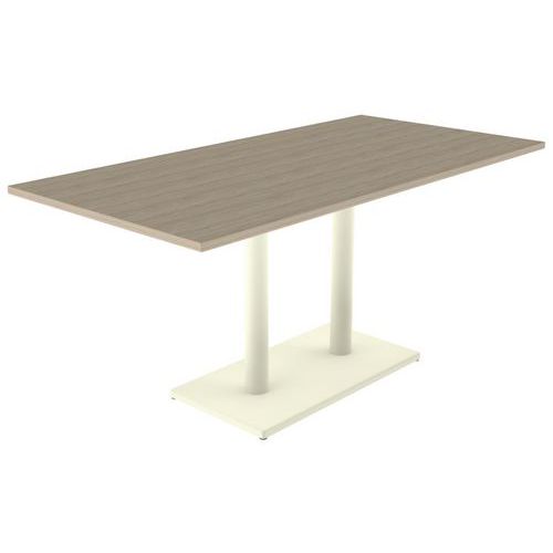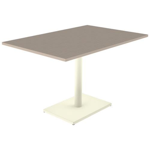 Table Menorca avec plateau stratifié contrebalancement blanc chant ABS. Piètement époxy : tube acier, embase, platine en fonte moulée sous le plateau. Contact au sol sur 4 vérins de réglages.