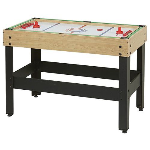 Table de jeu multifonctions avec 8 jeux différents dans le même meuble : baby foot (barres télescopiques, joueurs plastique), billard, hockey, tennis de table, basketball, jeu de fléchettes (sécurisé à ventouse), tir à l’arc (sécurisé à ventouse), casse boites.