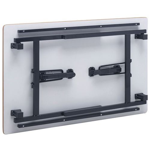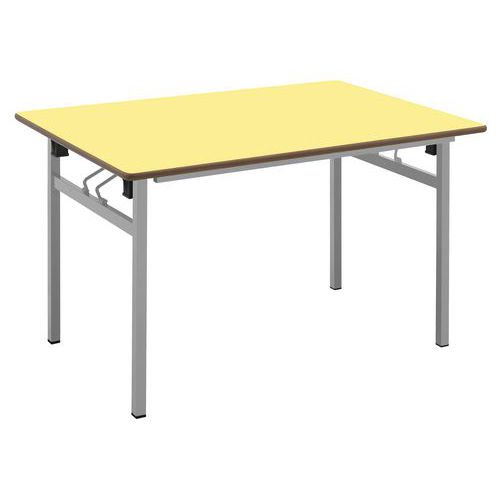 Table pliante T6 à renforts latéraux, empilable. Structure et plateau : panneau de particules d’une densité de 690 kg/m3 classé E1. Piètements en tube acier 30x30x1,5 mm, équipés de vérins non tachants, réglables. Plateau stratifié ép 21 mm, chants ABS 2 mm. Classement non feu M3. Conforme aux normes NFD 60-050 et 62-070.