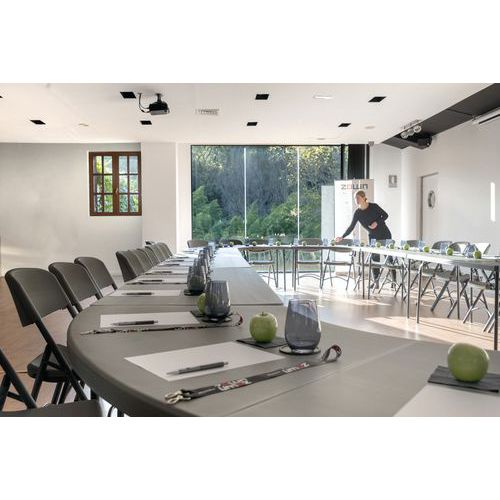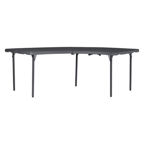 - Table pliante XL Moon en forme de demi-lune avec plateau 100% polyéthylène haute densité.